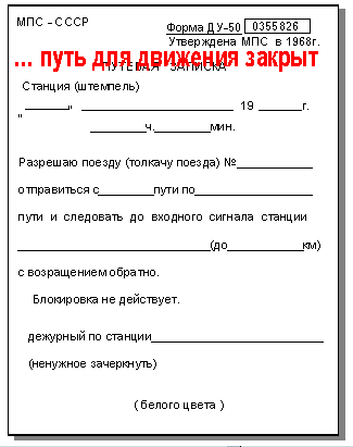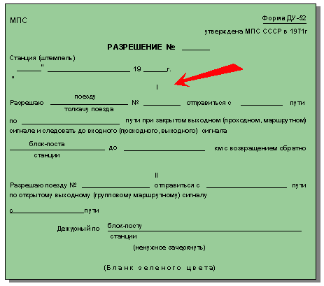 | Если поезд отправляется с подталкивающим локомотивом, то дежурный по станции и дежурный стрелочного поста, повторяющий распоряжение, добавляют слова «с толкачом» | ||